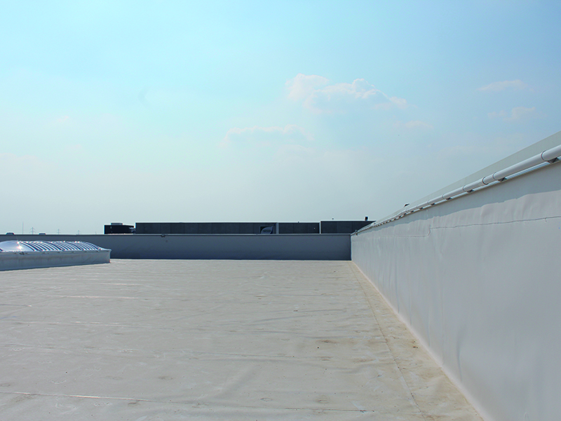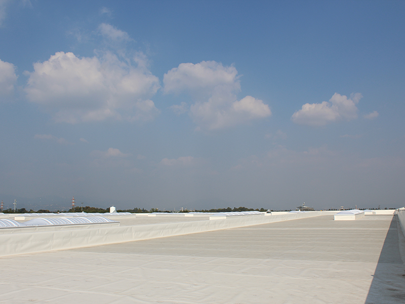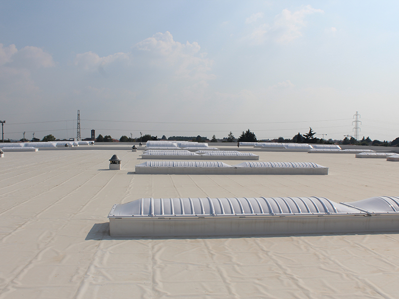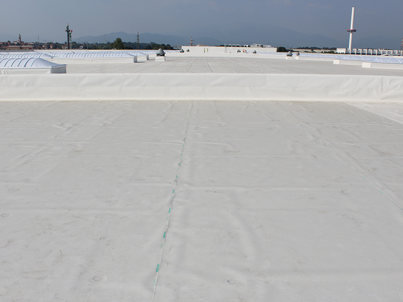 Installazione di membrana impermeabilizzante su tetto di 26.000 mq. Membrane fissate tramite fissaggio meccanico e induzione.