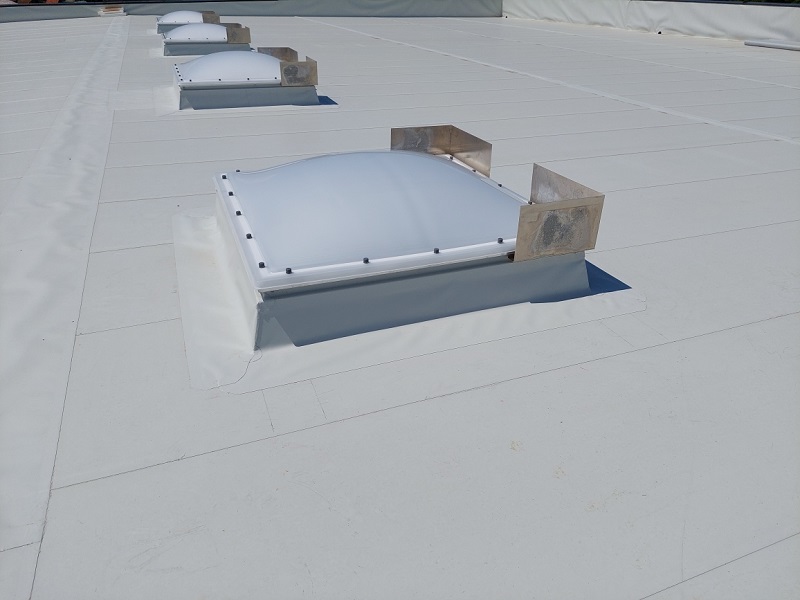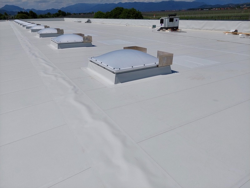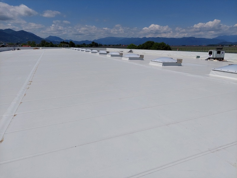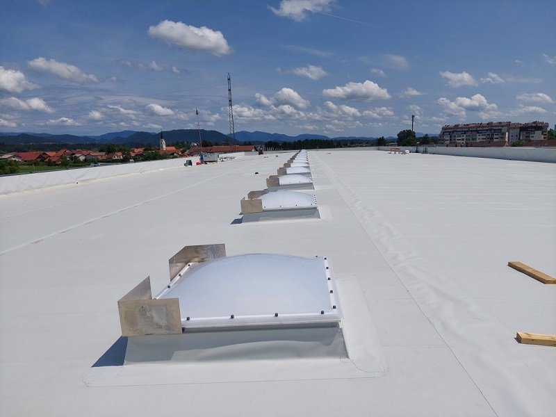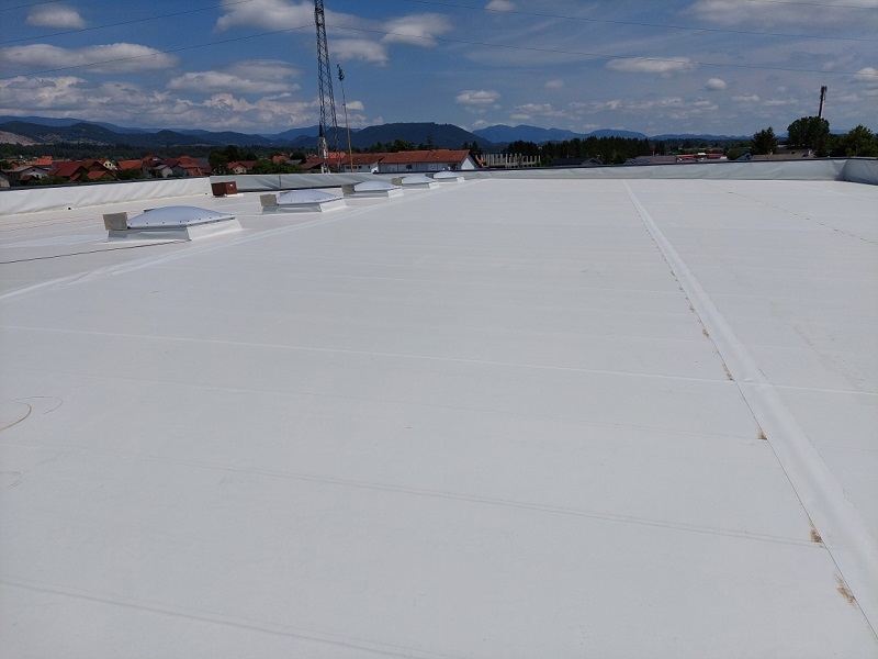 Izdelava ravne strehe s KÖSTER TPO strešnimi membranami. S KÖSTER TPO 1.8 se je pokrilo cca. 1.300 m2 strehe.