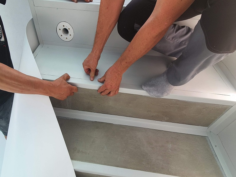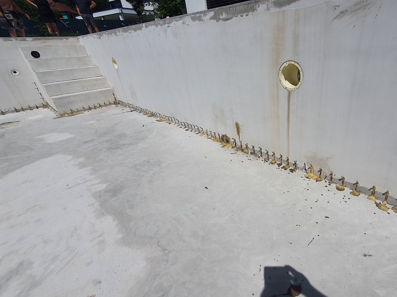 Sanacija nove bazenske AB školjke: stičenje delovnega stika s KÖSTER 2 IN 1; brušenje in priprava površine; izdelava negativne hidroizolacije s KÖSTER NB 1; zaščita prelivnega robu bazena s KÖSTER 21; finalna zaščita bazena s KÖSTER TPO Aqua.