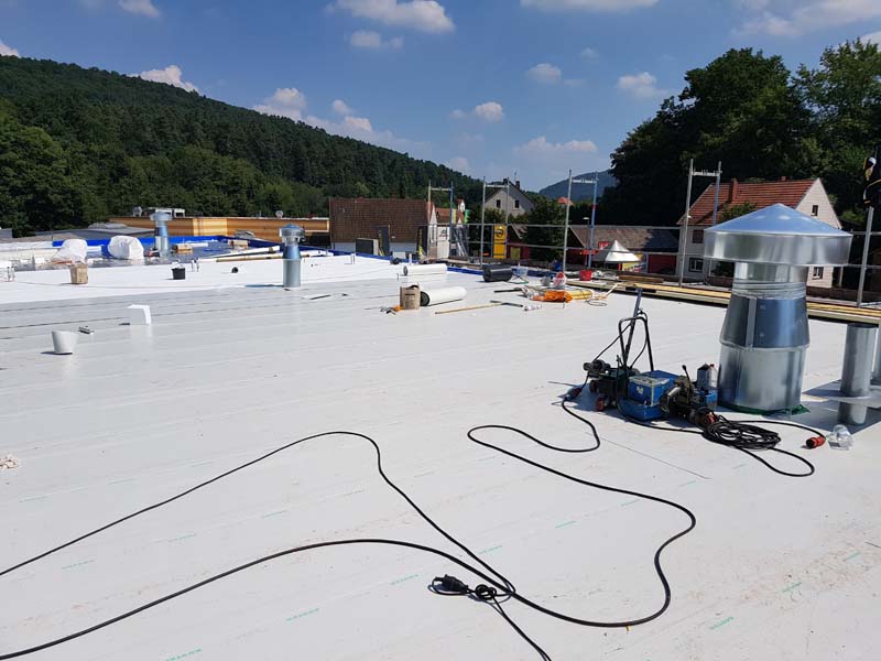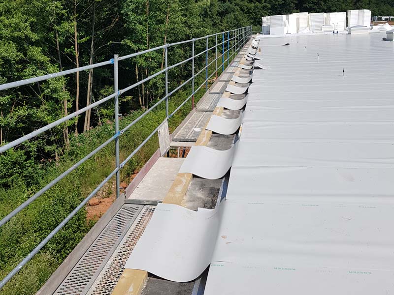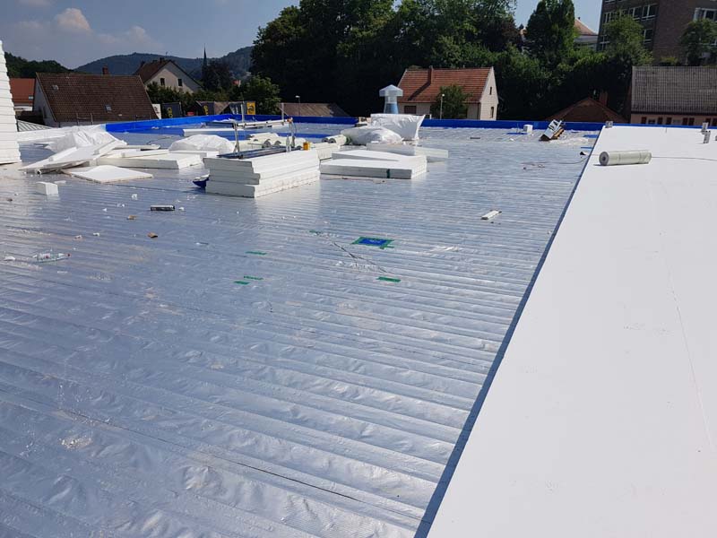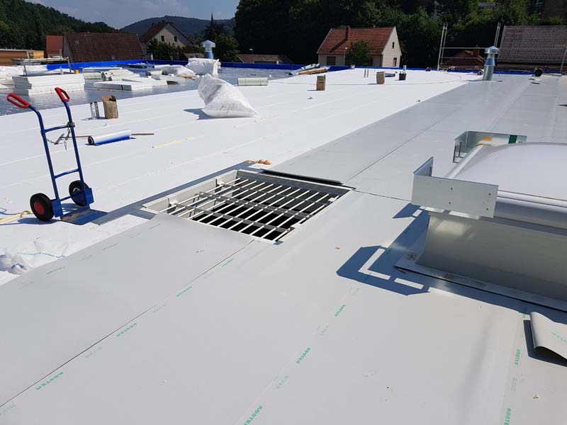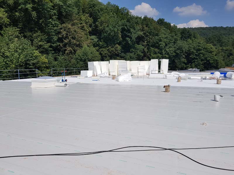 Neubau Pultdach 10° Dachneigung, Tragdecke Trapezblech, Dampfsperre, EPS-Wärmedämmung 200 mm, KÖSTER TPO 2,0 SK (FR) selbstklebend verlegt; Ausführung Juni-Juli 2018.