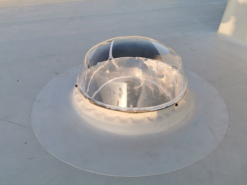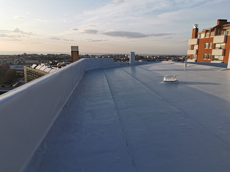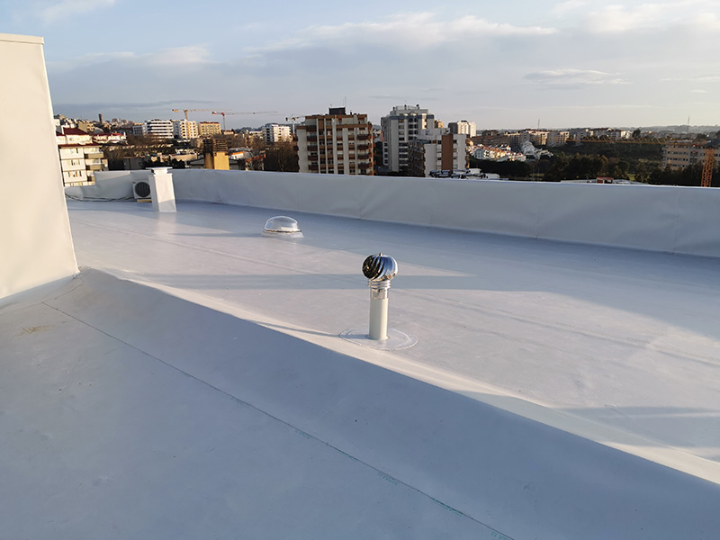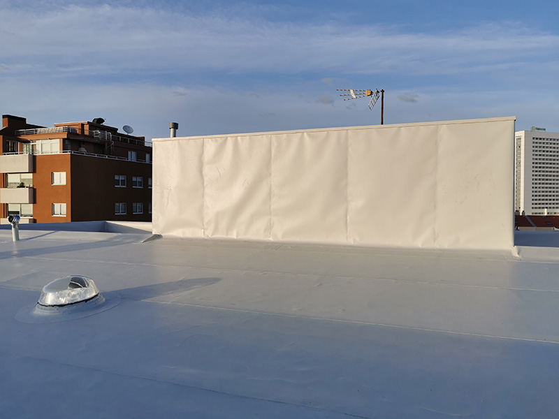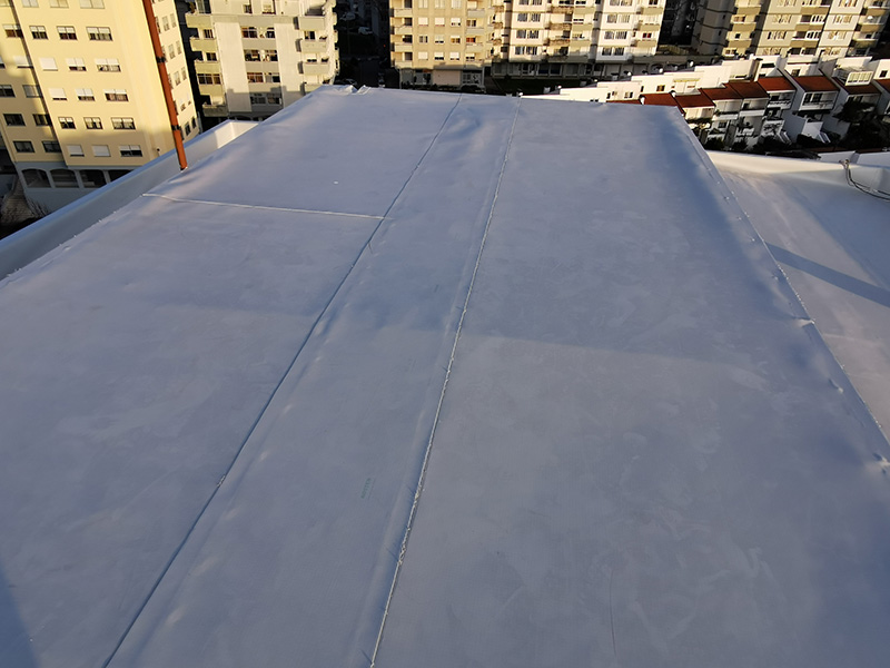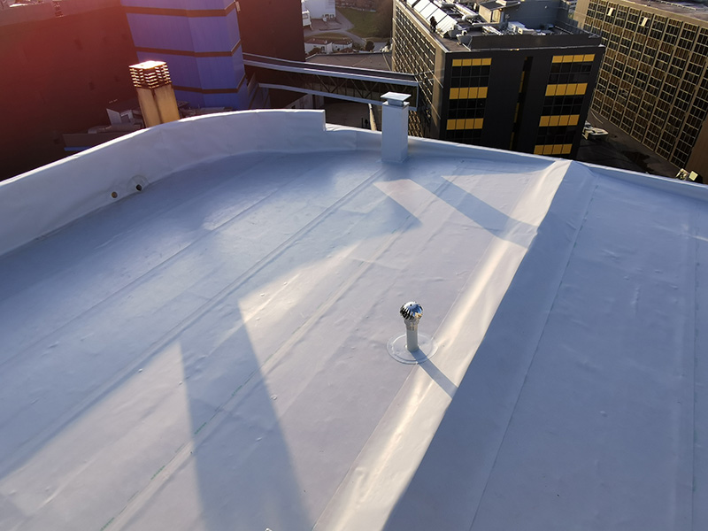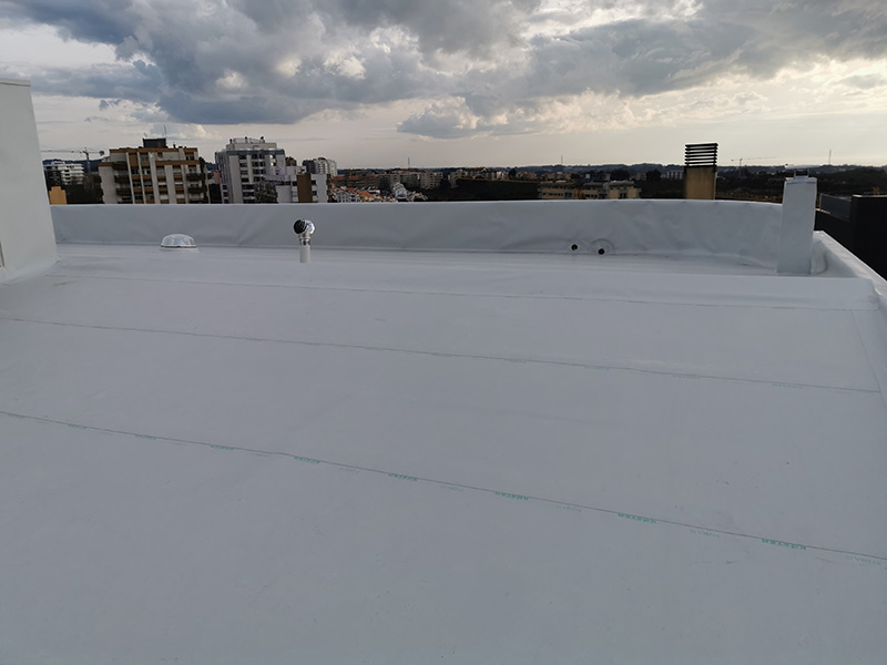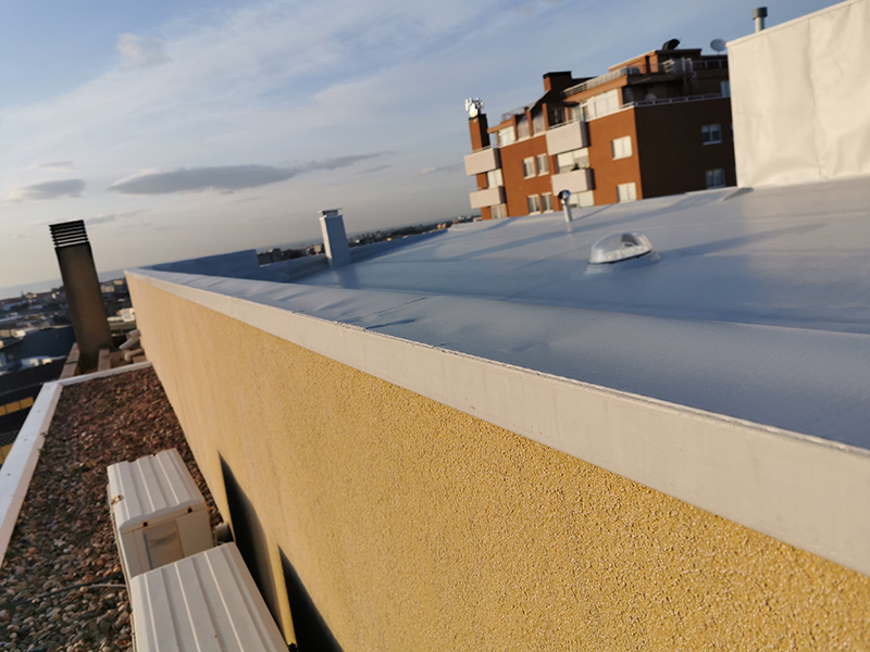 500 m² old fiber-cement roof rehabilitation with KÖSTER TPO membranes applied by strip adhesion with PUR adhesive on top of PIR insulation boards mechanically attached. KÖSTER accessories and details applied where needed.